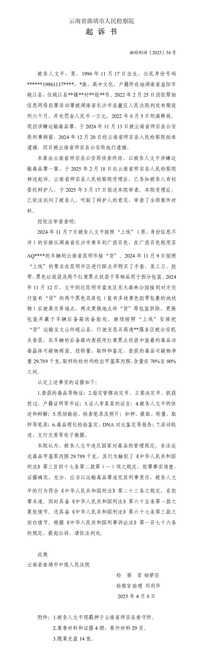 起诉书(文平运输毒品案)